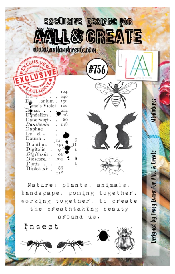 #756 MINIATURES text, animal and bug clear stamp set - Stämpelset med djur, insekter och texter från Tracy Evans AALL & Create A