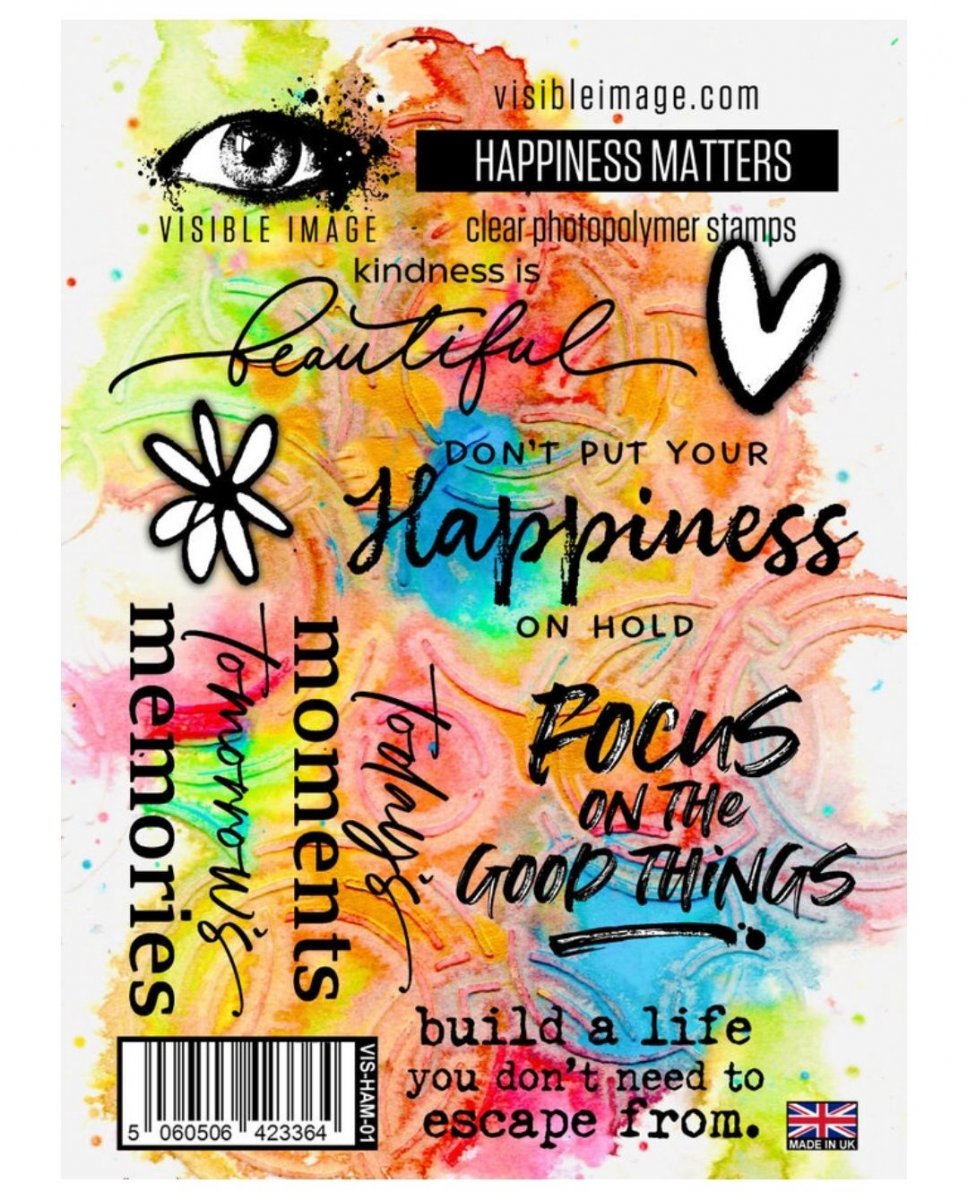HAPPINESS MATTERS text clear stamp set - Stämpelset med engelska texter från Visible image A6